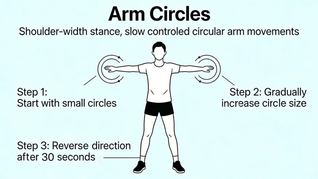 Stand with your feet shoulder‑width apart. Make slow, controlled circles with your arms, starting small and gradually getting larger. After 30 seconds, reverse direction. This opens up the shoulders and increases range of motion—essential for those looping strokes.